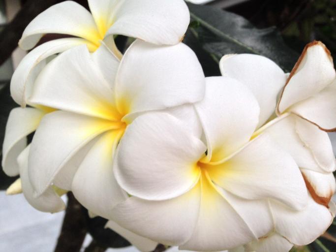 Keywords: plumeria flowers white blossoms blooms blooming bright petals flowering plants fragrant frangipani hawaiian fragrance floral decorative ornamental gardening gardens tropical exotic