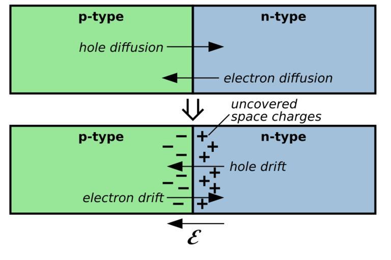 Keywords: Pn Junction Diffusion and Drift.svg Diagram of the diffusion across a pn junction with the resultant uncovered space charges the electric field and the drift currents own Own Drawing 2007-02-20 Inductiveload PN-junction diagrams