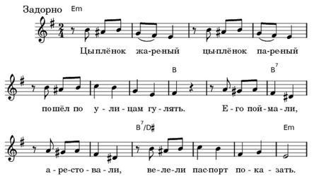 Keywords: Цыплёнок жареный.png Цыплёнок жа еный Цыплёнок жа еный own work in LilyPond based on http //a-pesni golosa info/dvor/cyplenok gif Music and lyrics are folk art / мелодия и слова на одное тво чество ~ 1918 public domain see below PD-RU-exempt Source code LilyPond source code used to create this file <pre> \version 2 12 2 << \new ChordNames \override ChordName 'font-size -1 \chordmode 0 e8 m r8 r4 r2 r2 r2 4 r2 r2 r2 b4 r4 8 r2 b4 7 r4 r2 r2 12 b8 7/dis r8 r4 r2 r2 e2 m \relative c' \mark Задо но \time 2/4 \key g \major 0 r8 b' ais b g fis e4 r8 b' ais b g fis e4 4 r8 b' ais b c4 b4 g4 e4 fis4 r4 8 r8 a gis a fis4 dis4 r8 a' gis a fis4 dis4 12 r8 b' ais b c4 b4 fis4 g4 e2 \addlyrics 0 Цы -- плё -- нок жа- е -- ный цы -- плё -- нок па- е -- ный 4 по -- шёл по у -- ли -- цам гу -- лять 8 Е -- го пой -- ма -- ли а -- е -- сто -- ва -- ли 12 ве -- ле -- ли пас -- по т по -- ка -- зать >> \layout \context \Score \remove Bar_number_engraver \override SpacingSpanner 'base-shortest-duration ly make-moment 1 20 \context \Lyrics \override LyricSpace 'minimum-distance 1 0 line-width 150 </pre> Sheet music Songs of Russia |