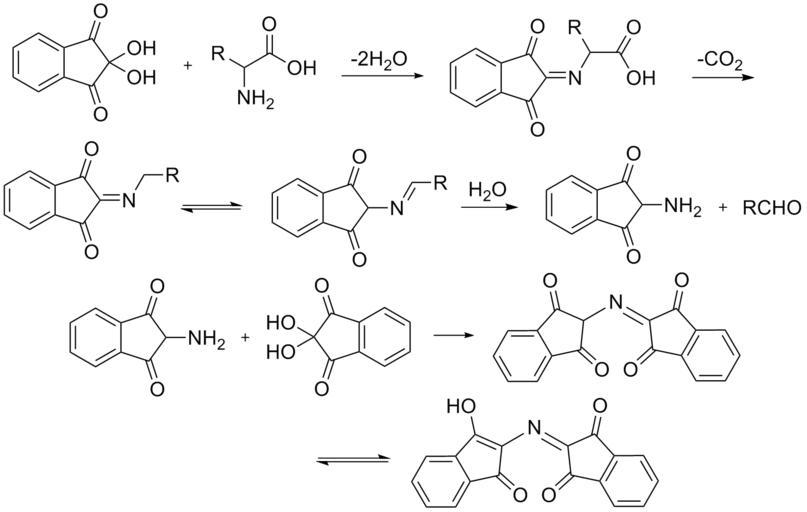 Keywords: 茚三酮反应过程.png 茚三酮反应过程<br />Ninhydrin reaction mechanism Own 2008-01-28 puppy8800 Ninhydrin_Reaction_Mechanism svg Chemical reactions Ninhydrin