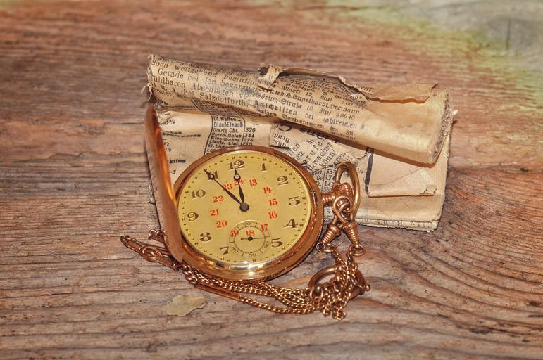 Keywords: pocket watch clock clock face time of jewellery gold newspaper rolled crumpled wood nostalgia