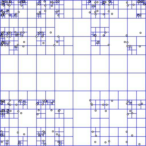 Keywords: Point quadtree.svg A point quadtree self-made; originally for http //www ics uci edu/~eppstein/pubs/EppGooSun-SoCG-05 pdf a talk at the 21st ACM Symp on Computational Geometry Pisa June 2005 2005-05-31 David Eppstein Source code The Python source code for generating this image <syntaxhighlight lang python >import sys from random import seed randrange Recursive quadtree data structure def quadtree points topleft botright if len points > 1 print >>sys stderr splitting len points topleft botright mid toplefti+botrighti 0 5 for i in range 2 svgLine mid0 topleft1 mid0 botright1 svgLine topleft0 mid1 botright0 mid1 quadtree p for p in points if p0<mid0 and p1<mid1 topleft mid quadtree p for p in points if p0<mid0 and p1> mid1 topleft0 mid1 mid0 botright1 quadtree p for p in points if p0> mid0 and p1<mid1 mid0 topleft1 botright0 mid1 quadtree p for p in points if p0> mid0 and p1> mid1 mid botright SVG output utility routines nestingLevel None def svgTag s deltaIndentation 0 Send a single XML tag to the SVG file First argument is the tag with all its attributes appended Second arg is +1 -1 or 0 if tag is open close or both respectively global nestingLevel if deltaIndentation < 0 nestingLevel - 1 if nestingLevel sys stdout write '\t' nestingLevel sys stdout write '<' if deltaIndentation < 0 sys stdout write '/' sys stdout write s if not deltaIndentation sys stdout write ' /' sys stdout write '>\n' if deltaIndentation > 0 nestingLevel + 1 def svgHeader maxX maxY Start producing an SVG object The output bounding box runs from 0 0 to maxX maxY Must be followed by svg content and a call to svgTrailer global nestingLevel if nestingLevel is None sys stdout write < xml version 1 0 encoding iso-8859-1 > < DOCTYPE svg PUBLIC -//W3C//DTD SVG 1 1//EN http //www w3 org/Graphics/SVG/1 1/DTD/svg11 dtd > nestingLevel 0 svgTag 'svg xmlns http //www w3 org/2000/svg version 1 1 ' 'width dpt height dpt viewBox 0 0 d d ' maxX maxY maxX maxY 1 def svgTrailer End of SVG object svgTag 'svg' -1 def svgStyle style Start a group of svg items with the given style Argument is a string in the form of a list of svg item attributes Must be followed by svg content and a call to svgEndStyle svgTag 'g ' + style 1 def svgEdgeStyle index Look up edge style and call svgStyle with it svgStyle globals 'edgeStyle' + str index def svgEndStyle Finish group of styled svg items svgTag 'g' -1 def svgLine start end Output line segment from start to end coordinates Must be called within an svgStyle /svgEndStyle call pair svgTag 'line x1 d y1 d x2 d y2 d ' start+end def svgCircle center radius Output circle with given center and radius coordinates Must be called within an svgStyle /svgEndStyle call pair svgTag 'circle cx d cy d r s ' center+ radius Test code driver seed 27 svgRadius 2 svgBound 400 margin 4 def clusteredCoordinate clusteringExponent fractalExponent x long randrange 1000 clusteringExponent y 0 p 1 while x if x 1 y + p p fractalExponent x >> 1 return y def clusteredPoint return clusteredCoordinate 2 2 5 clusteredCoordinate 1 5 3 2 points clusteredPoint for i in range 250 maxX max x for x y in points maxY max y for x y in points scaleX 1 0 svgBound-2 margin /maxX scaleY 1 0 svgBound-2 margin /maxY points x scaleX+margin y scaleY+margin for x y in points svgHeader svgBound svgBound svgStyle 'fill none stroke blue ' svgLine 1 1 1 svgBound-1 svgLine 1 svgBound-1 svgBound-1 svgBound-1 svgLine svgBound-1 svgBound-1 svgBound-1 1 svgLine svgBound-1 1 1 1 quadtree points 1 1 svgBound-1 svgBound-1 svgEndStyle svgStyle 'fill white stroke black ' for p in points svgCircle p svgRadius svgEndStyle svgTrailer </syntaxhighlight> Computational geometry Files by User David Eppstein from en wikipedia Quadtrees Images with Python source code |