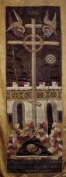Keywords: Pokrov True Cross by Anastasia Romanovna's workshop (1557, Sergiev Posad).jpg Голгофский к ест Век XVI Дати овка 16 в 1557 г ате иал Атлас шелковые се еб яные и золотные нити есто х анения Се гиево-Посадский госуда ственный исто ико-художественный музей-заповедник П оисхождение Во Вкладной книге 1673 г л 49 об с еди вкладов Ивана Г озного записано Пок ов отлас баг ов на нем схима да к ест шит золотом около к еста жемчюгом сажено у к еста два аггела шиты золотом и се еб ом подпись шита се еб ом Однако в Описи 1641 г л 119 об значатся два аналогичных пок ова один из кото ых запись восьмая описан так же как во Вкладной книге а д угой запись десятая несколько иначе п ичем отмечается имеющаяся на нем дата лета 7065 Последующие монасты ские описи связывают оба пок ова с именем ца я Ивана Г озного Опись 1756 г отмечает ха акте узо а их кайм около к еста низано жемчюгом в ефить - то есть узо в косую клетку Эти жемчужные об амления были спо оты по указу импе ат ицы Екате ины II в 1767 г Разме 183 х 72 Сох анность и естав ация Рестав и ован в 1974 г в ВХ РЦ им И Э Г аба я Т А Го ошко шитье и ткани ук еплены иглой Описание а с еднике - Голгофский к ест на фоне Ие усалимской стены; по сто онам его - копие и т ость; над к естом - два летящих ангела Фон с едника - ко ичневый атлас в д евности вишневый фон каймы - зеленовато-золотистый атлас Лики ангелов шиты несколько ыхлым атласным швом светло-се ым шелком с едва заметными п итенениями; все остальное - азноцветными шелками малиновым синим светло-зеленым бежевым се ым светло-голубым; п яденым и сканым золотом и се еб ом в п ик еп ; основные швы - косой яд го одок пе ышки ягодка Внизу под Голгофой шита се еб ом в т и ст оки летопись о вкладе асте ская ца ицы Анастасии Романовны XVI век Текст Лет 7065 1557 сделань пок овь cии повелением блгочестивого ц я и великог кнзя Ивана Васильевича гд я всея Руси п и ег блгчестивой ц це великой кнгини Анастасии и п и его блго одных чадех п и блго одном ц вче Иване и п и блго одной ц вне Евдокее в 23 лето ц тва его http //lib pstgu ru/icons/index2 php option com_content view article id 492126541 3C 1557 масте ская ца ицы Анастасии Романовны PD-old-100 Anastasia Romanovna Embroidery of Russian tsarinas and Grand Duchess 16th-century Russian orthodox embroidery Icons of the True Cross Embroidery in Museum of Sergiev Posad Files uploaded by Shakko from various sources Pokrov embroidery