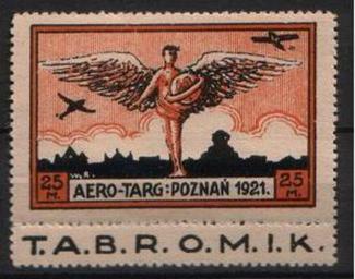 | Keywords: Poland 1921 Aero-Targ I.JPG Aero-Targ Company in agreement with the Polish Ministry of Post Telegraph Aero-Targ stamps had to be bought for airmail in addition to the normal express postage rate payable by usage of regular Polish stamps The stamp was designed by Wilhelm Rudy initials W R on the stamps and crudely lithographed Perforated 11 25 but also known imperforated This 25mk value shows Icarus against Poznan Attached to each stamp was an advertising label inscribed T A B R O M I K for vodka factory TAdeusz BROnislaw MIKołajczyk Forged stamps are known The first flights from Poznan to Gdansk and to Warsaw were on 29 May 1921 The first return flight from Warsaw to Poznan was on 31 May 1921 There were daily return flights until 16 June 1921 A special winged postmark was used from May 29 thru 16 June 1921 at the Poznan Fair Flights Postmarks with dates after 16 June 1921 are fake 1921 Scan of original Aero-Targ Company PD-old Stamps of Poland 1921 Airmail stamps Orange stamps History of Poznań Economy of Gniezno |
