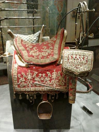 | Keywords: Poland Parade tack 01.jpg Poland firsthalf other date century 18 silver thread silk velvet leather wood niello gilt Institution District Museum in Tarn贸w Town Hall accession number object history credit line The tack is one of the finest examples of 18th century horse equipment created for the Polish 揕ithuanian Commonwealth's magnateria own See below cc-zero DEFAULTSORT 1701-1750; Parade tack Horse tacks in the District Museum in Tarn贸w | ||||