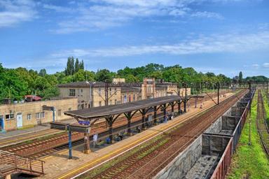 Keywords: poland station railroad railway depot platform buildings tracks train transportation trees outside summer spring hdr