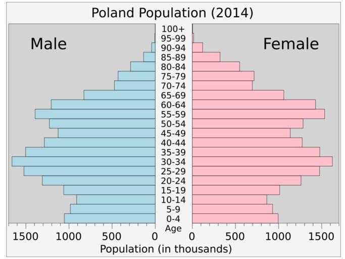 Keywords: Polandpop.svg translate yes en Current population pyramid of Poland 2014 from UN estimates World Population Prospects http //esa un org/unpd/wpp/Excel-Data/population htm The 2012 Revision 2014-08-28 own Delphi234 cc-zero Population pyramids of Poland Uploaded with UploadWizard |