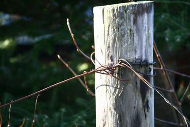 Keywords: pole wood wire fence worn rusty aged old corrosion