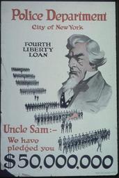 | Keywords: "Police Department. City of New York. Fourth Liberty Loan. Uncle Sam- We have pledged you $50, 000, 000." - NARA - 512686.jpg Scope and content General notes 512686 Local identifier 4-P-248 U S Food Administration Educational Division Advertising Section 01/15/1918 - 01/1919 Still Picture Records Section Special Media Archives Services Division NWCS-S National Archives at College Park 8601 Adelphi Road College Park MD 20740-6001 other date circa 1917 1919 Record group Record Group 4 Records of the U S Food Administration 1917 - 1920 Record group ARC 333 World War I Posters compiled 1917 - 1919 Series ARC 512439 File unit File unit ARC Variant control numbers NAIL Control Number NWDNS-4-P-248 Other versions <gallery> File Police_Department _City_of_New_York _Fourth_Liberty_Loan _Uncle_Sam-_We_have_pledged_you_ 50 _000 _000 _-_NARA_-_512686 tif tif File Police_Department _City_of_New_York _Fourth_Liberty_Loan _Uncle_Sam-_We_have_pledged_you_ 50 _000 _000 _-_NARA_-_512686 jpg jpg </gallery> NARA-cooperation PD-USGov World War I posters of the United States United States Food Administration |