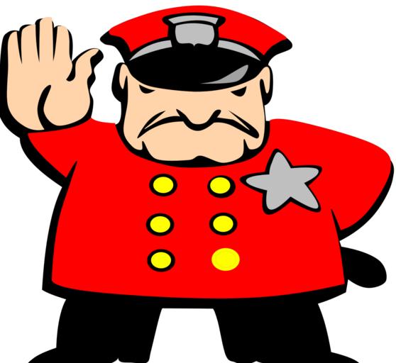 Keywords: police man angry stop hand up racket buttons uniform star fat