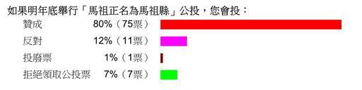 | Keywords: Polling results of Matsu Renaming.svg en Polling results showing the intended response if a referendum of renaming of Matsu is started zh-hans 马祖正名投票意向 zh-hant 馬祖正名投票意向 own Bencmq 2011-07-04 created with Inkscape validSVG Files by Bencmq SVG statistics Cross-Strait relations |