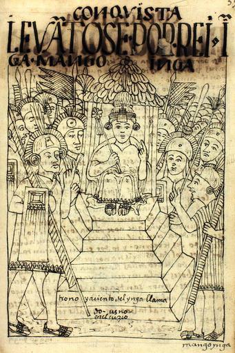 | Keywords: POMA0400v.jpg The newly reigning Manco Inka in his ceremonial throne in Cuzco cite book Felipe Guaman Poma de Ayala 1615 El primer nueva corónica y buen gobierno Peru p 400 http //www kb dk/permalink/2006/poma/info/en/frontpage htm The chapter of the Spanish conquest and the civil wars http //www kb dk/permalink/2006/poma/400/en/image/ open id2642390 imagesize XL 2008-07-28 1615 Felipe Guaman Poma de Ayala ca 1535 1616 PD-old-100-1923 Manco Inca Felipe Guamán Poma de Ayala | ||||