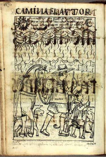 | Keywords: POMA1105.jpg The author on his way to Lima selfportrait From Felipe Guaman Poma de Ayala ca 1550-1616 Nueva corónica y buen gobierno Ms Copenhagen Royal Library GKS 2232 page 1105 http //www kb dk/permalink/2006/poma/info/en/frontpage htm 1615 original ; 2001 scanning The Royal Library Copenhagen Denmark Obtainable at cmb kb dk Department of Manuscripts and Rare Books The Royal Library Copenhagen Denmark PD-Art Felipe Guamán Poma de Ayala Self-portraits Nueva corónica y buen gobierno | ||||
