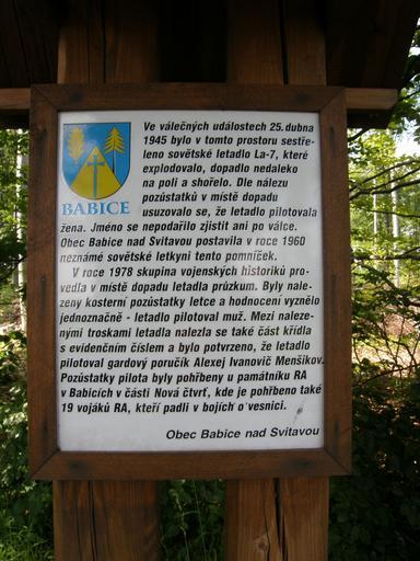 Keywords: Pomnik letcu (Babice nad Svitavou) 01.JPG cs Pomník letců u Babic nad Svitavou own Lukáš Malý 9 6 2008 uvolňuji dílo Babice nad Svitavou