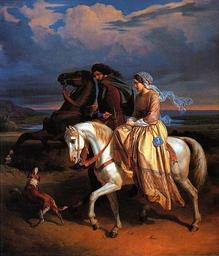 Keywords: Pompeo Molmenti - Pia de' Tolomei condotta in Maremma.jpg Artwork Creator Pompeo Marino Molmenti en Pia de' Tolomei Being Led to Maremma «Con questo dipinto esposto a Venezia nel 1853 l'artista affrontava per la prima volta il soggetto storico d'ispirazione letteraria caro alla cultura romantica Il tema tratto dal poemetto colmo di suggestioni medievaleggianti di Bartolomeo Sestini che tanto successo ebbe nel primo Ottocento si sofferma su un episodio trascurato dai pittori quello del mesto viaggio della Pia verso la sua prigione maremmana Le figure dei due viaggiatori minuziosamente descritte si stagliano sul paesaggio del litorale toscano reso cupo e malinconico dalla giornata nuvolosa in patetica armonia con lo stato d'animo della giovane sposa desolata Anche gli animali riflettono i sentimenti dei protagonisti focoso e irruento l'uno remissivo e al passo quello della Pia » Vedi fonte p 232 1853 oil canvas cm 102 82 Musei Civici Verona object history exhibition history credit line accession number place of creation Silvana Bietoletti Michele Dantin L'Ottocento italiano la storia gli artisti le opere Giunti Editore 2002 http //books google it/books id 5AmBboSoKQoC pg PA233 p 233 http //www palazzodellaragioneverona it/gam-achielle-forti/le-opere-dell-allestimento/photo/107 html Galleria d'Arte Moderna Achille Forti “ http //www palazzodellaragioneverona it/images/jartists/med/1395402910 jpg image Custom license marker 2013 02 18 PD-old-auto 1894 Uploaded with UploadWizard Pompeo Marino Molmenti Pia de' Tolomei Horse riding in paintings Black horses in art White horses in art Romantic paintings of horses Romantic history paintings Romantic paintings in Italy Maremma 1853 oil on canvas paintings Paintings by Pompeo Marino Molmenti in the Museo di Castelvecchio Verona |