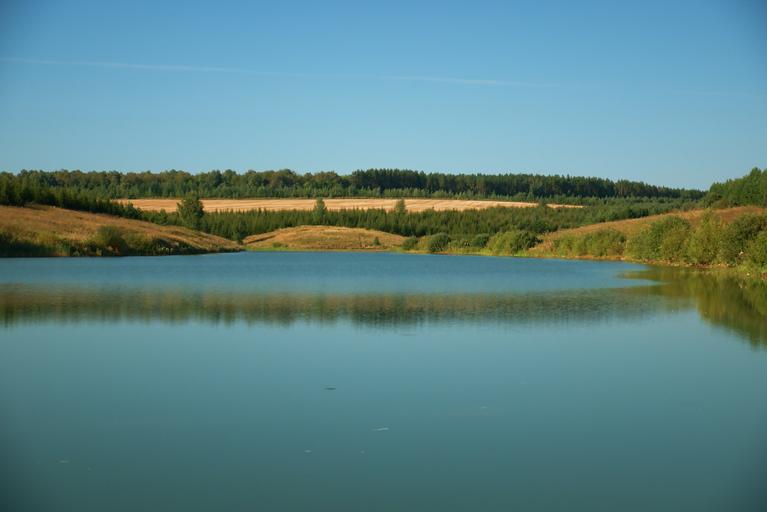 Keywords: pond water blue quiet body of water reflection in the water sky trees field hills spruce landscape nature summer forest tree lake