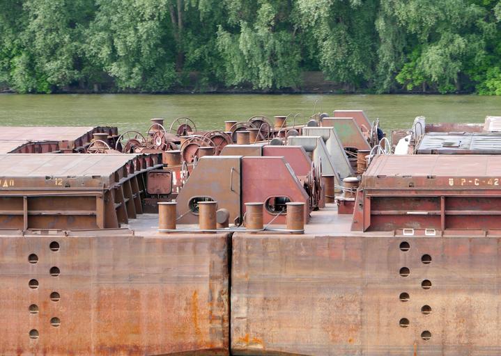 Keywords: pontons connected danube navigation relapsing union lightened steel cables danube typical rusty rusted serbia anchored current river