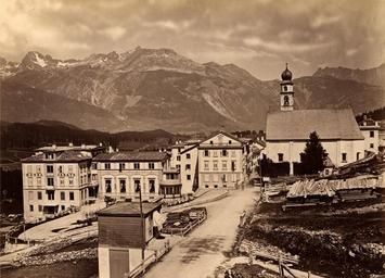 | Keywords: Pontresina Laret San Niculo 1875.jpg Pontresina Eingang zum Unterdorf Laret mit der Pfarrkirche San Niculò und dem Hotel Saratz Datierung zwischen 1875 talseitige Erweiterung Hotel Saratz und 1880 Aufstockung des Ursprungsbaus des Hotel Saratz Albumin Fotografie 1880 n a San Niculò Pontresina Albumen prints Hotel Saratz old photos PD-old |
