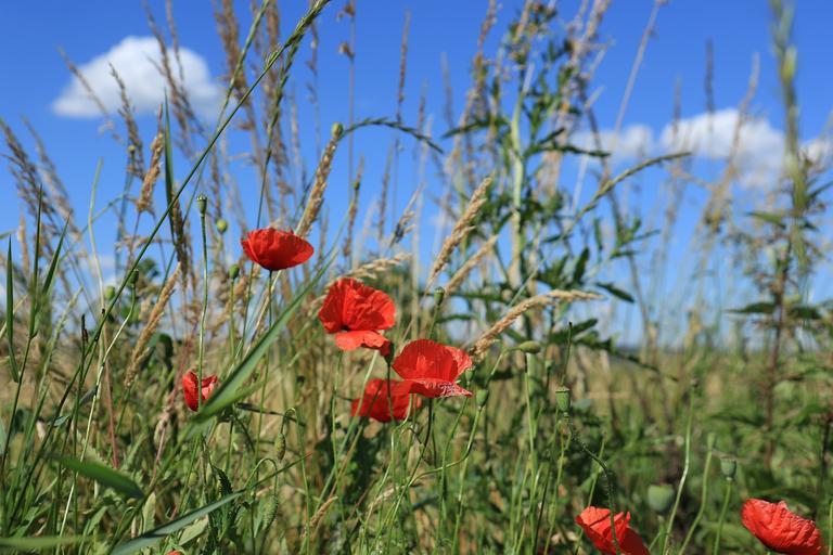 Keywords: poppies meadow grass sky clouds summer red fields field of poppies blue nature flowers
