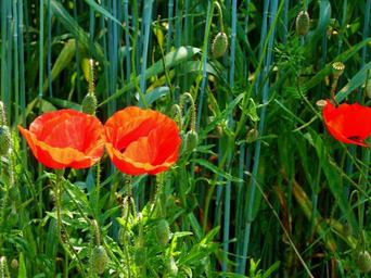Keywords: poppy klatschmohn cornfield fields edge of field cereals sky june red summer wheat wheat field agriculture
