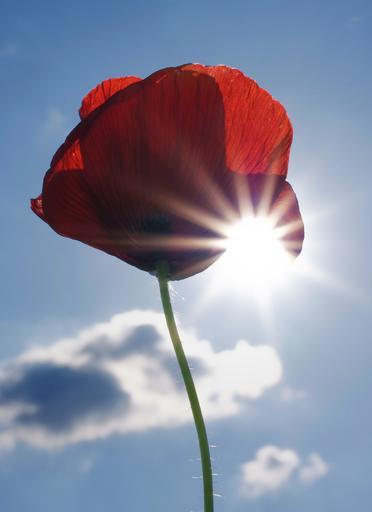 Keywords: poppy poppy flower blossom bloom flower red sky blue clouds back light sun light on nature sunbeam