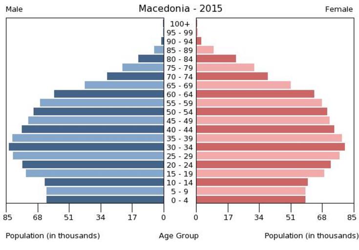 | Keywords: Population pyramid of Macedonia 2015.png en A population pyramid illustrates the age and sex structure of population and may provide insights about political and social stability as well as economic development The population is distributed along the horizontal axis with males shown on the left and females on the right The male and female populations are broken down into 5-year age groups represented as horizontal bars along the vertical axis with the youngest age groups at the bottom and the oldest at the top The shape of the population pyramid gradually evolves over time based on fertility mortality and international migration trends Віково-статева пі аміда населення Республіки акедонія за 2015 ік Вона дає наочне уявлення п о вікову і статеву ст укту а населення к аїни може слугувати дже елом інфо мації п о політичну і соціальну стабільність економічний озвиток Блакитними кольо ами ліво уч у вигляді го изонтальних смуг показані вікові г упи по 5 оків кожна чоловічої статі п аво уч ожевими жіночої аймолодші вікові г упи внизу найста іші вго і Фо ма пі аміди поступово еволюціонує з плином часу під впливом чинників на оджуваності сме тності і світової міг ації https //www cia gov/library/publications/the-world-factbook/ The World Factbook 2016-09-21 The Central Intelligence Agency Цент альне озвідувальне уп авління PD-USGov Population pyramids of Macedonia |