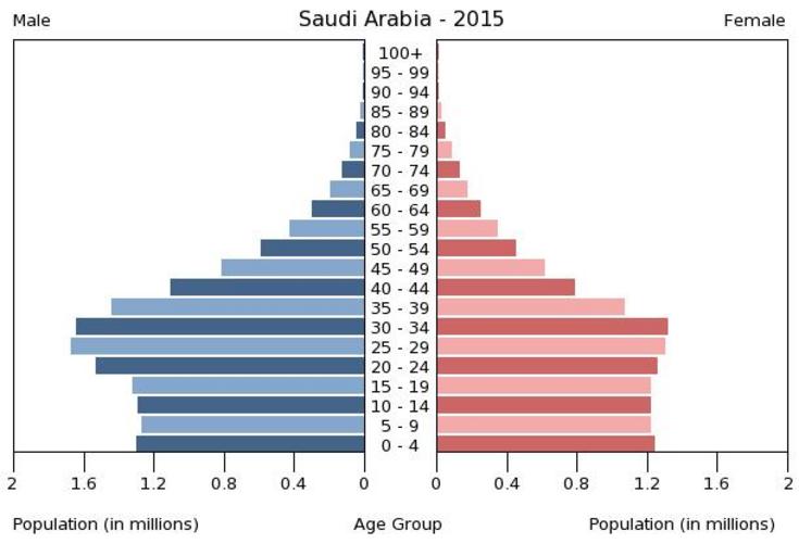 | Keywords: Population pyramid of Saudi Arabia 2015.png en A population pyramid illustrates the age and sex structure of population and may provide insights about political and social stability as well as economic development The population is distributed along the horizontal axis with males shown on the left and females on the right The male and female populations are broken down into 5-year age groups represented as horizontal bars along the vertical axis with the youngest age groups at the bottom and the oldest at the top The shape of the population pyramid gradually evolves over time based on fertility mortality and international migration trends Віково-статева пі аміда населення Саудівської А авії за 2015 ік Вона дає наочне уявлення п о вікову і статеву ст укту а населення к аїни може слугувати дже елом інфо мації п о політичну і соціальну стабільність економічний озвиток Блакитними кольо ами ліво уч у вигляді го изонтальних смуг показані вікові г упи по 5 оків кожна чоловічої статі п аво уч ожевими жіночої аймолодші вікові г упи внизу найста іші вго і Фо ма пі аміди поступово еволюціонує з плином часу під впливом чинників на оджуваності сме тності і світової міг ації https //www cia gov/library/publications/the-world-factbook/ The World Factbook 2016-09-21 The Central Intelligence Agency Цент альне озвідувальне уп авління PD-USGov Population pyramids of Saudi Arabia |