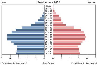 | Keywords: Population pyramid of Seychelles 2015.png en A population pyramid illustrates the age and sex structure of population and may provide insights about political and social stability as well as economic development The population is distributed along the horizontal axis with males shown on the left and females on the right The male and female populations are broken down into 5-year age groups represented as horizontal bars along the vertical axis with the youngest age groups at the bottom and the oldest at the top The shape of the population pyramid gradually evolves over time based on fertility mortality and international migration trends Віково-статева пі аміда населення Сейшельських Ост овів за 2015 ік Вона дає наочне уявлення п о вікову і статеву ст укту а населення к аїни може слугувати дже елом інфо мації п о політичну і соціальну стабільність економічний озвиток Блакитними кольо ами ліво уч у вигляді го изонтальних смуг показані вікові г упи по 5 оків кожна чоловічої статі п аво уч ожевими жіночої аймолодші вікові г упи внизу найста іші вго і Фо ма пі аміди поступово еволюціонує з плином часу під впливом чинників на оджуваності сме тності і світової міг ації https //www cia gov/library/publications/the-world-factbook/ The World Factbook 2016-09-21 The Central Intelligence Agency Цент альне озвідувальне уп авління PD-USGov Population pyramids of Seychelles |