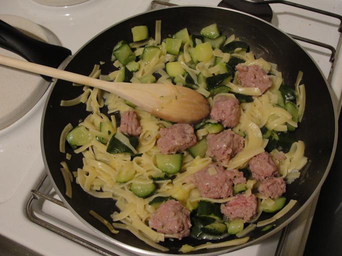 Keywords: Por kourj tag.JPG fr Morceaux de porc cuisinés aux tagliatelles et courgette own Julien Bertrand 2010-12-04 Food preparation Cuisine of France Wooden spoons Courgette dishes