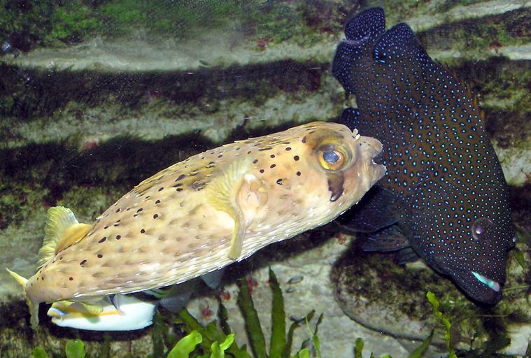 Keywords: Porcupine.pufferfish.arp.jpg Porcupine pufferfish Diodon holocanthus at Bristol Zoo Bristol England On the right is a Blue-spotted grouper Cephalopholis argus and partially hidden on left a Picasso triggerfish Photographed by Adrian Pingstone 2005-12 Adrian Pingstone Arpingstone 51 27 51 8 N 2 37 18 6 W Diodon holocanthus Cephalopholis argus Bristol Zoo Gardens Aquarium |