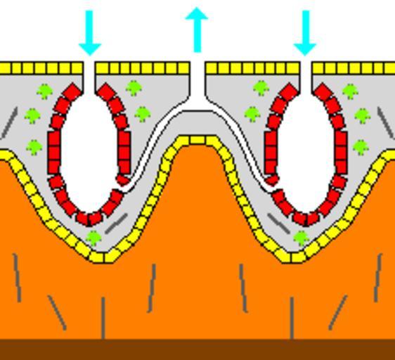 Keywords: Porifera calcifying 01.png en Porifera - calcifying sponge for use with Template Annotated image Colours yellow pinacocytes red choanocytes pale grey mesohyl lime green archecytes and other cells in mesohyl dark grey spicules orange calcium carbonate brown substrate cyan water flow Ref cite book Ruppert E E Fox R S and Barnes R D Invertebrate Zoology Brooks / Cole 7 0030259827 2004 76-97 Own Philcha Porifera calcifying 01-2 png Porifera diagrams |