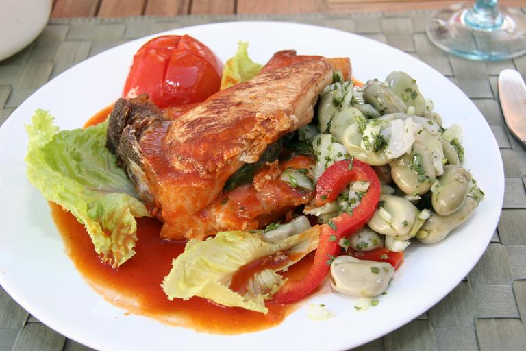 Keywords: pork chop spinach tomato salad food dining fried piement pepper beans bean salad tomato sauce