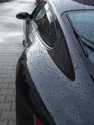 Keywords: porsche auto flank fender paint black run off raindrop rain wet shine