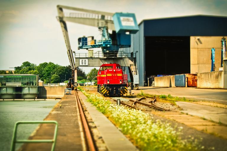 Keywords: port crane harbour crane water envelope loading crane rhine industry inland port harbour cranes marketing hub düsseldorf anchorage loco diesel locomotive locomotive gleise tilt shift