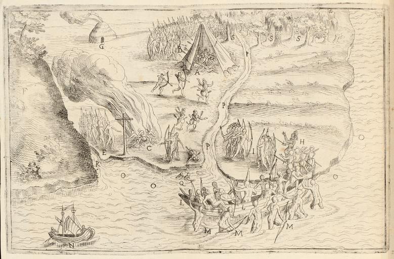 Keywords: Port Fortuné, altercation.tif fr Altercation de Port Fortuné entre Français et des Indiens Nauset 1606 A Le lieu ou eÅ¿toiet les François Å¿aiÅ¿ans le pain B Les Å¿auuages Å¿urprenans les François en tirant Å¿ur eux à coups de fleÅ¿ches C François bruflez par les Å¿auuages D François s ™enfuians à la barque tout lardés de fleÅ¿ehes E Trouppes de fauuages faiÅ¿ans bruÅ¿ler les François qu ™ils auoient tués F Montaigne fur le port G Cabannes des Å¿auuages H François à terre chargeans les Å¿auuages I Sauuages desfaicts par les François L Chalouppe où eÅ¿toient les François M Sauuages autour de la chalouppe qui furent Å¿urpris par nos gens N Barque du Å¿ieur de Poitrincourt O Le port P Petit ruiÅ¿eau Q François tombez morts dans l ™eau penÅ¿ans Å¿e Å¿auuer à la barque R RuiÅ¿eau venant de certins mareÅ¿cages S Bois par où les Å¿auuages venoient à couuert 1613-01-01 http //memory loc gov/master/rbc/rbfr/0012/01720000 tif Samuel de Champlain other versions 41 681944 -69 960278 PD-old-70-1923 Samuel de Champlain History of North America United States in the 1610s |