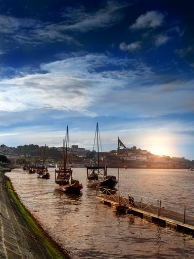 Keywords: porto sunset dusk portugal boats clouds horizon sun silhouettes river shore backlight spring afternoon landscape twilight