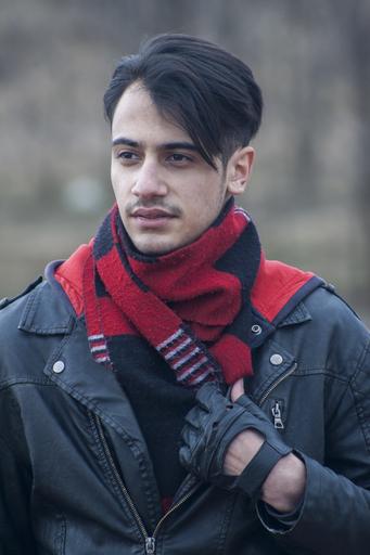 Keywords: portrait boy comforter jacket biker scarf hairstyle leader gloves style fashion model