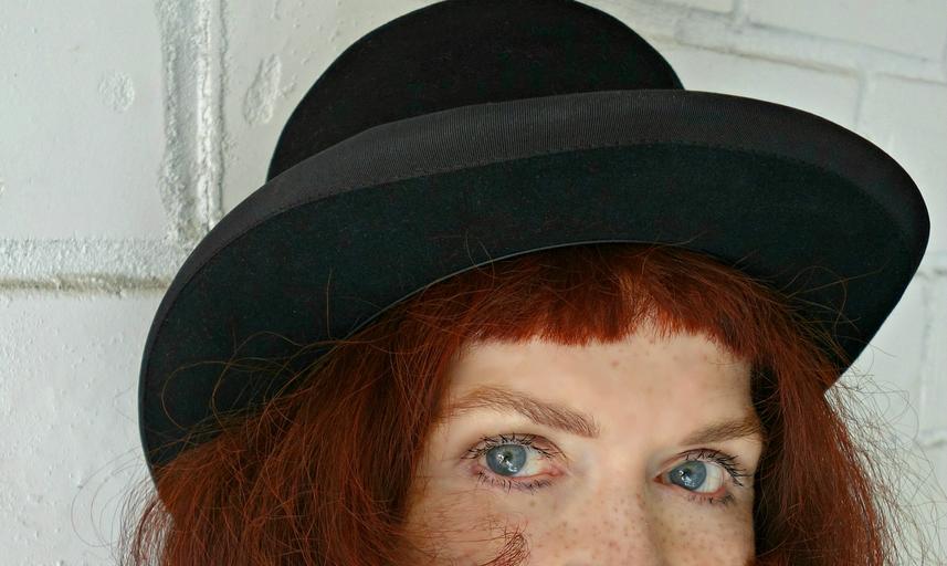 Keywords: portrait face woman face redhead female adult white hair head eyes blue-gray eyes attractive hat woman wearing hat bowler hat close up