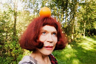 Keywords: portrait face woman red head red hair attractive caucasian blue eyes fruit orange female expression