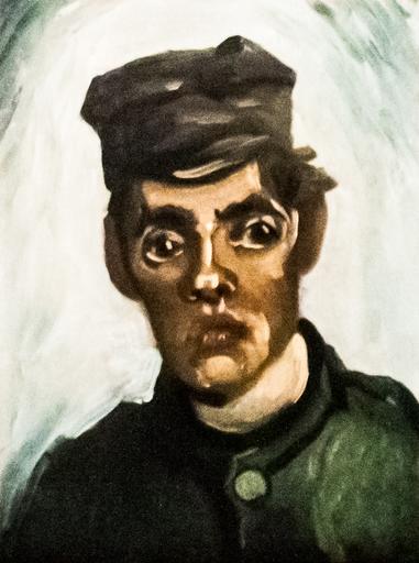 Keywords: Portrait of Gijsbertus de Groot - My Dream.jpg Artwork Creator Vincent van Gogh Fiatal paraszt simléderes sapkában Portrait of Gijsbertus de Groot Kopf eines jungen Bauern mit Schirmmütze Tête d'un jeune paysan avec une casquette Hoofd van een jonge boer met een pet Gijsbertus de Groot Nuenen 1885 03 Oil on canvas digital reconstruction cm 44 5 33 5 Institution Nelson-Atkins Museum of Art accession number object history credit line Van Gogh catalogues 165 688 Photo by Szilas at the Van Gogh My Dream Exhibition in Budapest 2013 Commonist PD-old-100 DEFAULTSORT Van Gogh 1885-03 Nuenen Head of a Young Peasant in a Peaked Cap F_165 JH_688 jpg Head of a young peasant in a peaked cap by Vincent van Gogh