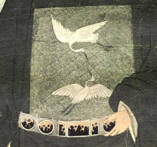 | Keywords: Portrait of Jiang Shunfu, badge detail.jpg Detail on a Ming Dynasty portrait of the Chinese official Jiang Shunfu 1453 1504 now in the Nanjing Museum The decoration of two cranes on his chest are a rank badge that indicate that he was a civil official of the first rank; refer to page 282 of Patricia Ebrey's paperback edition of Cambridge Illustrated History of China http //depts washington edu/chinaciv/clothing/11preqin htm Mingqing renwuxiaoxiang huaxuan Nanjing Nanjing Bowuguan 1979 pl 16 Late 15th century Anonymous PD-art 100px Paintings of the Ming Dynasty Portrait paintings of men of China Cranes in art Clothing of China Belts Mandarin square |