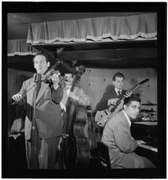 | Keywords: (Portrait of Sam Hall Kaplan, Frenchy Cauette, Chuck Wayne, and Deryk Sampson, Three Deuces, New York, N.Y., ca. June 1947) (LOC) (5354795866).jpg Gottlieb William P 1917- photographer Portrait of Sam Hall Kaplan Frenchy Cauette Chuck Wayne and Deryk Sampson Three Deuces New York N Y ca June 1947 1 negative b w ; 2 1/4 x 2 1/4 in Notes Gottlieb Collection Assignment No 193 Purchase William P Gottlieb Forms part of William P Gottlieb Collection Library of Congress In Small combo jazz progresses great vibist sparks the De Arango 5; Caplan Most Music Makers dug Down Beat v 14 no 13 June 18 1947 p 17 Subjects Kaplan Sam Hall Cauette Frenchy Wayne Chuck Sampson Deryk Jazz musicians--1940-1950 Violinists--1940-1950 Pianists--1940-1950 Guitarists--1940-1950 Fifty-second Street New York N Y --1940-1950 Three Deuces Format Portrait photographs--1940-1950 Group portraits--1940-1950 Film negatives--1940-1950 Rights Info Mr Gottlieb has dedicated these works to the public domain but rights of privacy and publicity may apply http //lcweb2 loc gov/diglib/ihas/html/gottlieb/gottlieb-copyright html lcweb2 loc gov/diglib/ihas/html/gottlieb/gottlieb-copyrig Repository negative Library of Congress Prints Photographs Division Washington D C 20540 USA http //hdl loc gov/loc pnp/pp print hdl loc gov/loc pnp/pp print Part Of William P Gottlieb Collection DLC 99-401005 General information about the Gottlieb Collection is available at http //lcweb2 loc gov/diglib/ihas/html/gottlieb/gottlieb-home html lcweb2 loc gov/diglib/ihas/html/gottlieb/gottlieb-home html Persistent URL http //hdl loc gov/loc music/gottlieb 13371 hdl loc gov/loc music/gottlieb 13371 Call Number LC-GLB23- 1337<br/> PD-Gottlieb https //www flickr com/photos/library_of_congress/5354795866/ Portrait of Sam Hall Kaplan Frenchy Cauette Chuck Wayne and Deryk Sampson Three Deuces New York N Y ca June 1947 LOC https //www flickr com/people/8623220 N02 The Library of Congress http //www loc gov/rr/print/195_copr html noknown The Library of Congress Flickr Commons Flickr-no known copyright restrictions The Library of Congress https //flickr com/photos/8623220 N02/5354795866 2015-09-02 00 13 28 pd 1940s Black and white photographs of men Portraits with piano Bass sound Violins Photographs by William P Gottlieb |