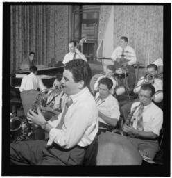 | Keywords: (Portrait of Serge Chaloff, Georgie Auld, Red Rodney, and Tiny Kahn, New York, N.Y., ca. Aug. 1947) (LOC) (4888058633).jpg Gottlieb William P 1917- photographer Portrait of Serge Chaloff Georgie Auld Red Rodney and Tiny Kahn New York N Y ca Aug 1947 1 negative b w ; 2 1/4 x 2 1/4 in Caption from Down Beat Auld and his band interrupt their rehearsing to pose for Bill Gottlieb's camera They are now playing at the Troubadour which is the new name for much-named Dixon's Notes Gottlieb Collection Assignment No 015 Reference print available in Music Division Library of Congress Purchase William P Gottlieb Forms part of William P Gottlieb Collection Library of Congress In Ballads planned to subdue be-bop in Auld's band Down Beat v 14 no 18 Aug 27 1947 p 15 Subjects Chaloff Serge 1923-1957 Auld Georgie 1919- Rodney Red Kahn Tiny Jazz musicians--1940-1950 Saxophonists--1940-1950 Double bassists--1940-1950 Drummers Musicians --1940-1950 Trombonists--1940-1950 Format Portrait photographs--1940-1950 Group portraits--1940-1950 Film negatives--1940-1950 Rights Info Mr Gottlieb has dedicated these works to the public domain but rights of privacy and publicity may apply http //lcweb2 loc gov/diglib/ihas/html/gottlieb/gottlieb-copyright html lcweb2 loc gov/diglib/ihas/html/gottlieb/gottlieb-copyrig Repository negative Library of Congress Prints Photographs Division Washington D C 20540 USA http //hdl loc gov/loc pnp/pp print hdl loc gov/loc pnp/pp print reference print Library of Congress Music Division Washington D C 20540 USA http //loc gov/rr/perform/ loc gov/rr/perform/ Part Of William P Gottlieb Collection DLC 99-401005 General information about the Gottlieb Collection is available at http //lcweb2 loc gov/diglib/ihas/html/gottlieb/gottlieb-home html lcweb2 loc gov/diglib/ihas/html/gottlieb/gottlieb-home html Persistent URL http //hdl loc gov/loc music/gottlieb 00331 hdl loc gov/loc music/gottlieb 00331 Call Number LC-GLB23- 0033<br/> PD-Gottlieb https //www flickr com/photos/library_of_congress/4888058633/ Portrait of Serge Chaloff Georgie Auld Red Rodney and Tiny Kahn New York N Y ca Aug 1947 LOC https //www flickr com/people/8623220 N02 The Library of Congress http //www loc gov/rr/print/195_copr html noknown The Library of Congress Flickr Commons Flickr-no known copyright restrictions The Library of Congress https //flickr com/photos/8623220 N02/4888058633 2015-09-02 00 12 54 pd Photographs by William P Gottlieb |