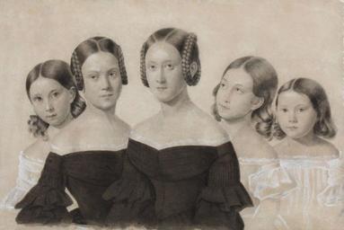 | Keywords: Portrait of Sisters Dyakov.jpg en Portrait of Sisters Yelisaveta Maria Praskovya Alexandra and Anna Dyakov ru По т ет доче ей Алексея иколаевича Дьякова 1790 1837 Елизавета 1833 1875; в замуж Жемчужникова а ия 1830 1889; в зам Сухотина П асковья Александ а 1831 1890; в зам Оболенская и Анна скан еизвестный художник 1830-е House of Dyakov Family portraits of Russia House of Obolensky Zhemchuzhnikov family PD-old | ||||