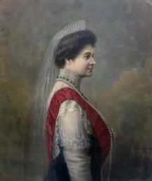 | Keywords: Portrait of Tsaritsa Eleonora of Bulgaria - oil painting.jpg Гео ги Евстатиев Picture taken in Veliko Tarnovo exhibition Symbols of the bulgarian system of state 22 of Semtember 2008 Пакко PD-art Unknown painters Location of museum or gallery missing Eleonora of Bulgaria Necklaces in art Portrait paintings of women at half length Sashes of chivalric orders in portrait paintings Portrait paintings of women wearing tiaras diadems Veils in art | ||||