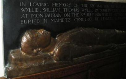 Keywords: Portsmouth Cathedral 3.JPG en Close-up of memorial to W T Wyllie in Portsmouth Cathedral This bronze is a work by William Robert Colton The inscription behind Colton's bronze reads- IN LOVING MEMORY OF THE SECOND SON OF WILLIAM LIONEL AND MARION AMY WYLLIE 2ND DURHAM LIGHT INFANTRY KILLED IN ACTION AT MONTAUBAN ON THE 19TH JULY 1916 WHILST ACTING AS BRIGADE MAJOR AND BURIED MAMETZ CEMETERY HE LEAVES A WIDOW AND THREE CHILDREN W T Wyllie was killed during the Battle of the Somme and his regiment was part of the 18th Brigade of the 6th Division He is buried in DANTZIG ALLEY BRITISH CEMETERY MAMETZ SOMME in grave VIII F 9 He was the son of William Lionel Wyllie 1851-1931 the marine artist own Weglinde Gordon Lawson 2011-03-15 Cc-zero William Robert Colton Portsmouth Cathedral interior |