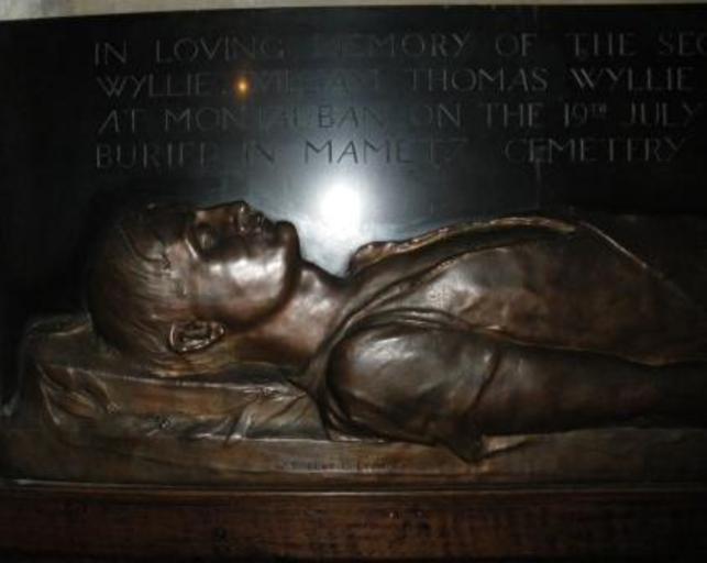 Keywords: Portsmouth Cathedral 4.JPG en Close-up of memorial to W T Wyllie in Portsmouth Cathedral This bronze is a work by William Robert Colton The inscription behind Colton's bronze reads- IN LOVING MEMORY OF THE SECOND SON OF WILLIAM LIONEL AND MARION AMY WYLLIE 2ND DURHAM LIGHT INFANTRY KILLED IN ACTION AT MONTAUBAN ON THE 19TH JULY 1916 WHILST ACTING AS BRIGADE MAJOR AND BURIED MAMETZ CEMETERY HE LEAVES A WIDOW AND THREE CHILDREN W T Wyllie was killed during the Battle of the Somme and his regiment was part of the 18th Brigade of the 6th Division He is buried in DANTZIG ALLEY BRITISH CEMETERY MAMETZ SOMME in grave VIII F 9 He was the son of William Lionel Wyllie 1851-1931 the marine artist own Weglinde Gordon Lawson 2011-03-15 Cc-zero William Robert Colton Portsmouth Cathedral interior |