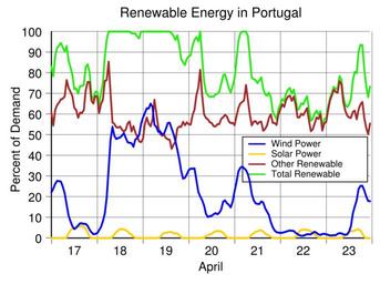 | Keywords: Portugal renewable energy production April 17-23 2016.svg translate yes en For over half of the week of May 7-13 2016 all of the electricity used in Portugal was generated from renewable energy A peak of 147 of demand was produced from renewable energy from 6 to 7 am on May 9 Excess electricity was exported when generation exceeded 100 of demand Data source https //transparency entsoe eu/generation/r2/actualGenerationPerProductionType/show entsoe 2016-07-12 own Delphi234 other versions Generated with Wikimedia SVG Chart SVG Chart/box cc-zero Solar energy in Portugal Wind power in Portugal Renewable energy in Portugal May 2016 in Portugal |