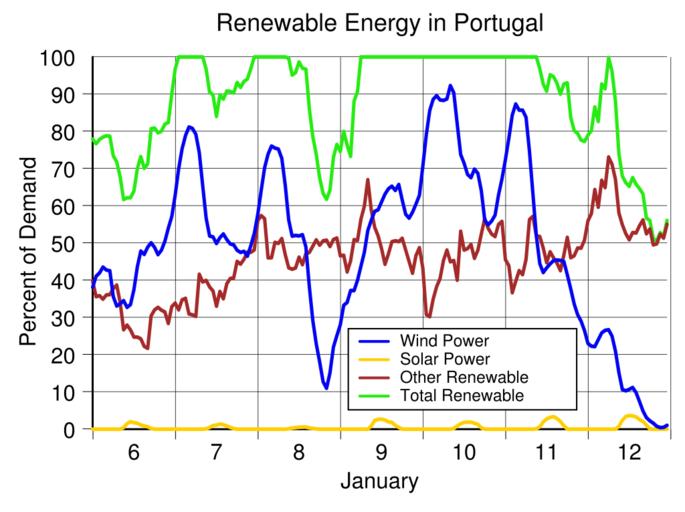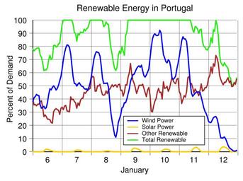 Keywords: Portugal renewable energy production January 6-12 2016.svg translate yes en For the weekend of January 9-10 2016 all of the electricity used in Portugal was generated from renewable energy A peak of 137 of demand was produced from renewable energy from 8 to 9 am on January 10 Excess electricity was exported when generation exceeded 100 of demand Data source https //transparency entsoe eu/generation/r2/actualGenerationPerProductionType/show entsoe 2016-05-20 own Delphi234 other versions Generated with Wikimedia SVG Chart SVG Chart/box cc-zero Solar energy in Portugal Wind power in Portugal Renewable energy in Portugal January 2016 in Portugal |