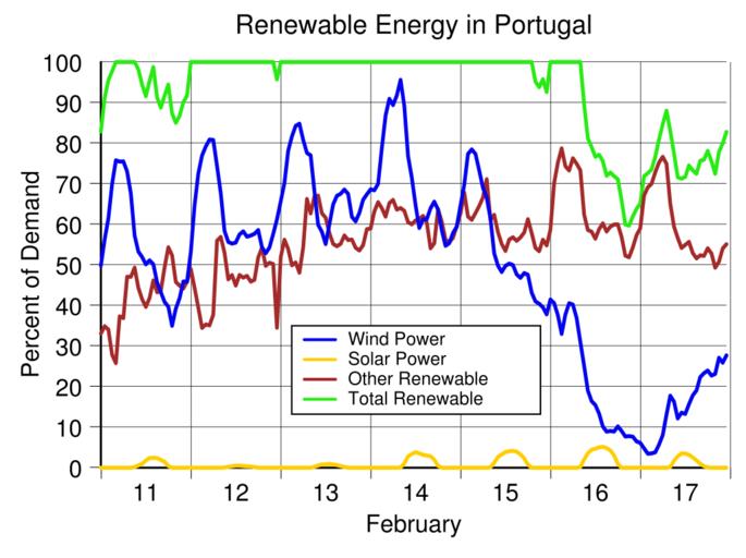 | Keywords: Portugal renewable energy production February 11-17 2016.svg translate yes en For over half of the week of February 11-17 2016 all of the electricity used in Portugal was generated from renewable energy A peak of 160 of demand was produced from renewable energy from 8 to 9 am on February 14 Excess electricity was exported when generation exceeded 100 of demand Data source https //transparency entsoe eu/generation/r2/actualGenerationPerProductionType/show entsoe own Delphi234 2016-05-21 Generated with Wikimedia SVG Chart SVG Chart/box Cc-zero Solar energy in Portugal Wind power in Portugal Renewable energy in Portugal February 2016 in Portugal |